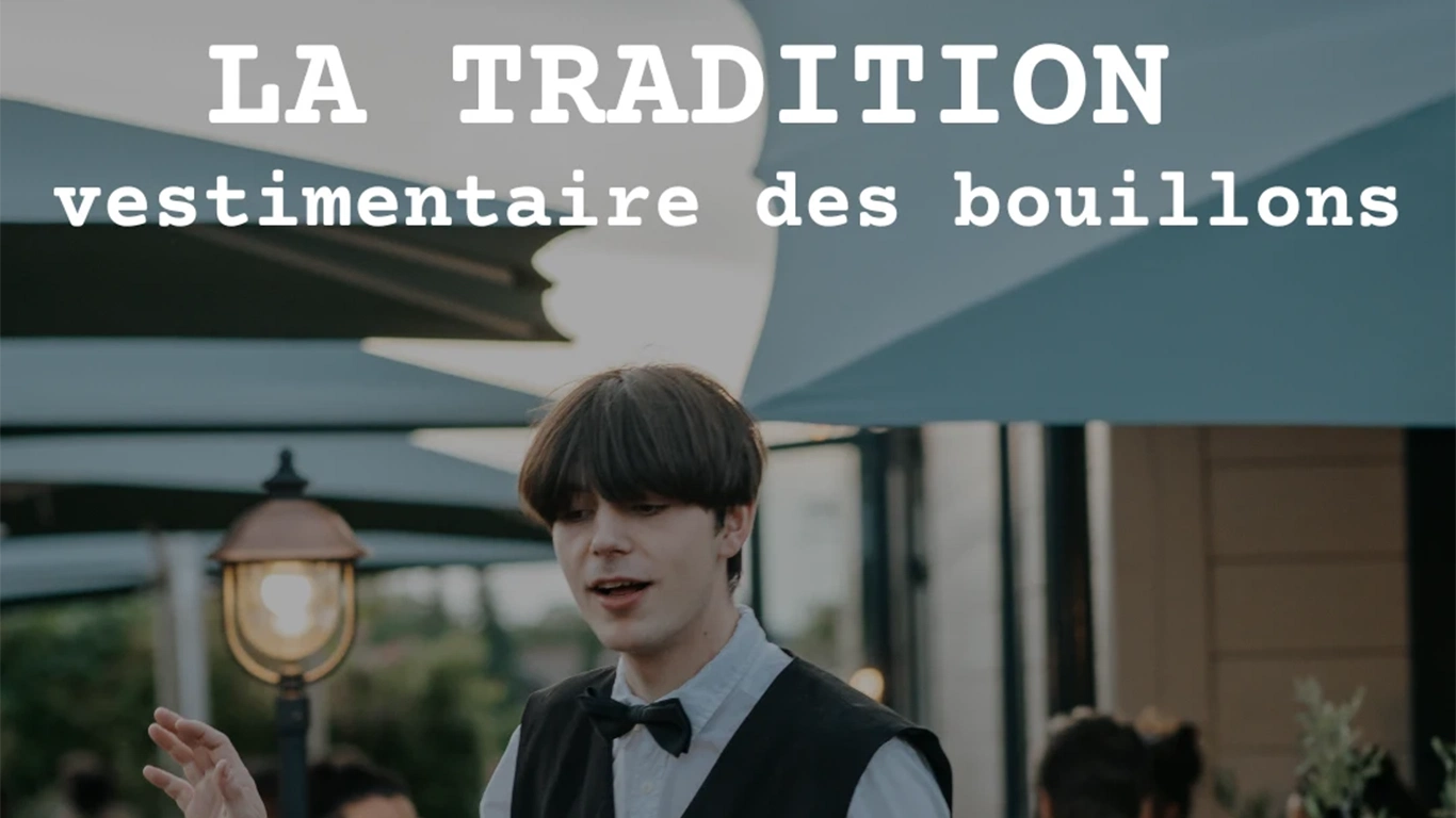 La célèbre tenue des bouillons, composée du tablier blanc et de la chemise noire ou blanche, trouve ses racines au XIXe siècle dans les brasseries et les premiers bouillons parisiens.